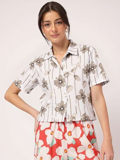 women printed collared short sleeve crop shirt - 21983480 - Very Small Image - 1