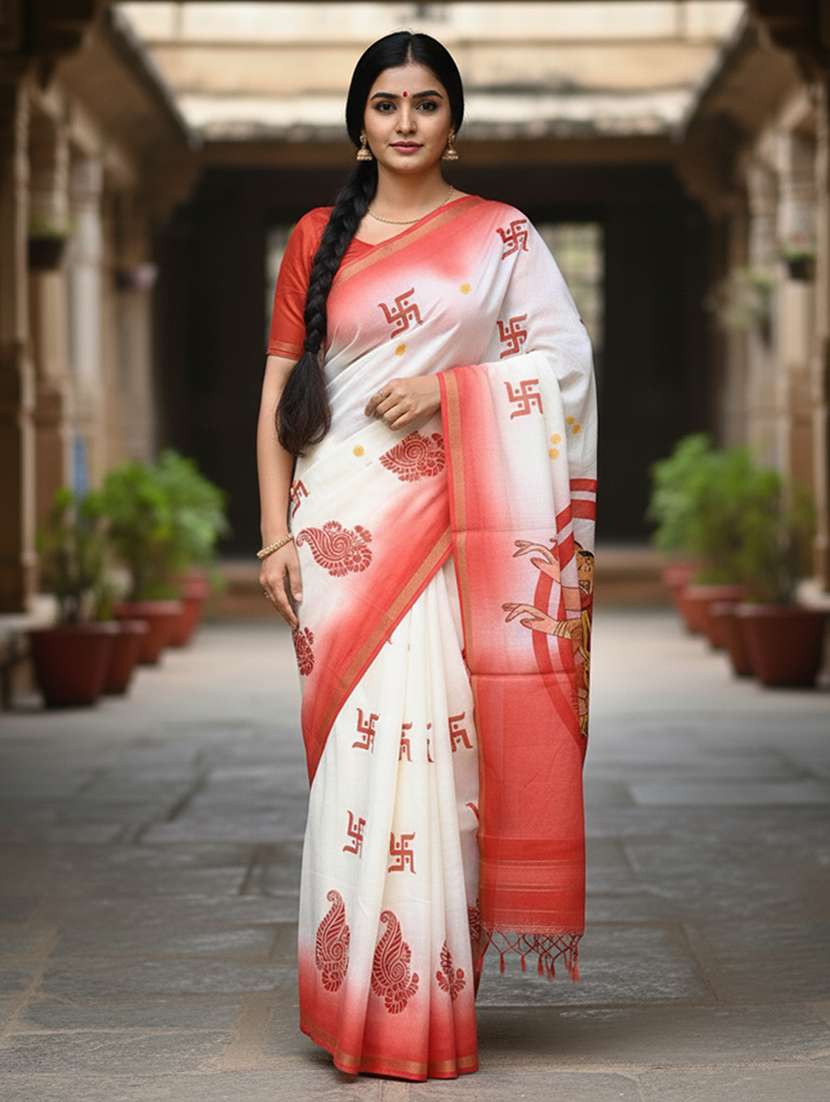 This off-white and red digital printed saree, featuring a magnificent artistic depiction of Goddess Durga on the pallu. Designed with sacred motifs and highlighted with a bold contrast red border, this saree is a true reflection of divine elegance and festive grandeur. Crafted from a soft mul cotton blend, it drapes effortlessly and offers all-day comfort, making it perfect for festive occasions, Durga Puja, Navratri, temple visits, and cultural gatherings. The saree comes with a matching red blouse piece, allowing you to customize it to suit your personal style