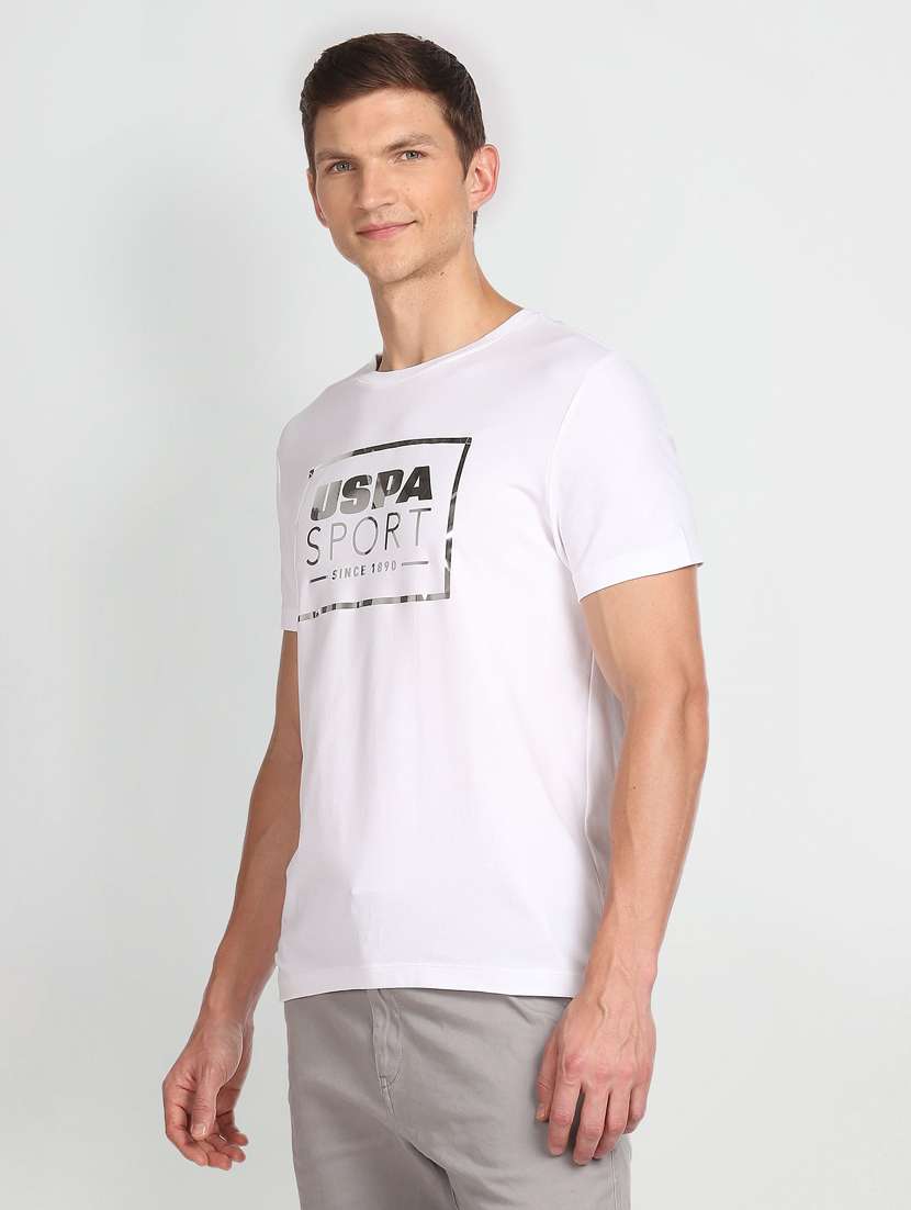 white cotton blend chest print t-shirt