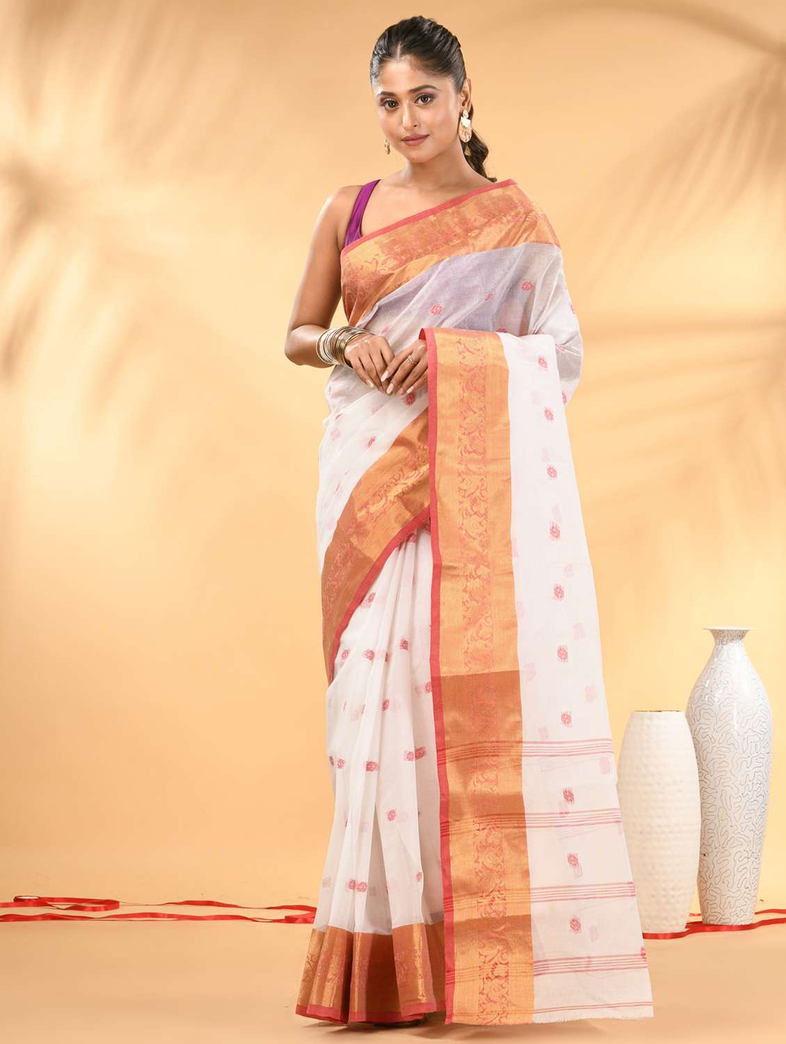 Embrace effortless elegance with this White Tant cotton saree, delicately woven by Bengal's skilled artisans. The saree features a stunning combination of golden zari borders, highlighted with intricate motifs on the pallu. Scattered resham butis in shades of orange and green add a subtle charm to the body. Lightweight and breathable, this saree is perfect for daytime functions, festive occasions, or elegant everyday wear.