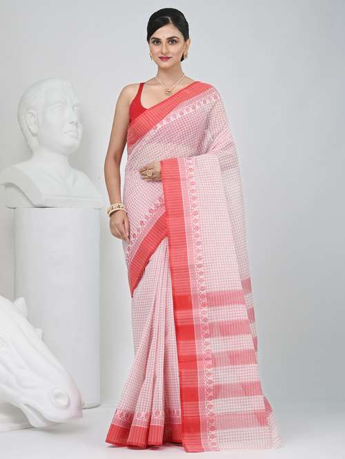 This elegant Tant saree blends tradition with contemporary charm, showcasing a sophisticated checked pattern in soothing white and red hues. The saree's gentle texture, crafted from premium cotton, ensures comfort and breathability, making it perfect for both daytime events and evening gatherings. The alternating stripes in white and red offer a stylish contrast, while the intricate lace-like border adds a delicate touch of craftsmanship to the design. Ideal for festive occasions or casual gatherings, this saree provides a versatile and chic option for modern women. Pair it with statement jewelry and a stylish blouse to complete the look, adding a touch of elegance to your ensemble. This handcrafted piece is a timeless addition to any saree collection.