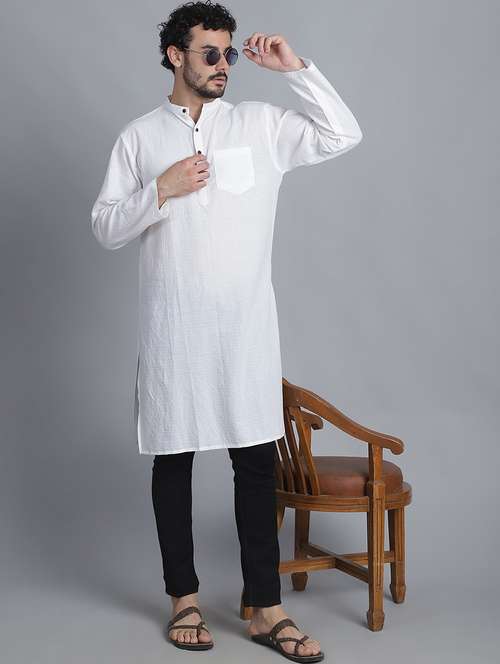Enchanted Drapes Mens White Printed Stripes Long Kurta