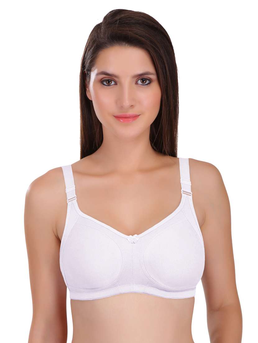 Featherline Perfect Fitted Poly Cotton Non-Padded Seamless Full Coverage Women's Minimizer Bra. The M-frame, full-support bra is crafted with poly cotton fabric. Its straps are centrally aligned ensuring a comfortable feel. The bra is non-wired and prevents any discomfort. The bra provides full coverage and excellent conical shape with its seamless cups. The reinforced seam, broad side wings and U-shaped back offer additional support. The broad back band and brushed elastic give a smooth and soft feel. Its underbust is designed with imported elastic. The high centre gore and a cute bow in between add to its style. Elasticated Adjustable Straps for snug fit.
