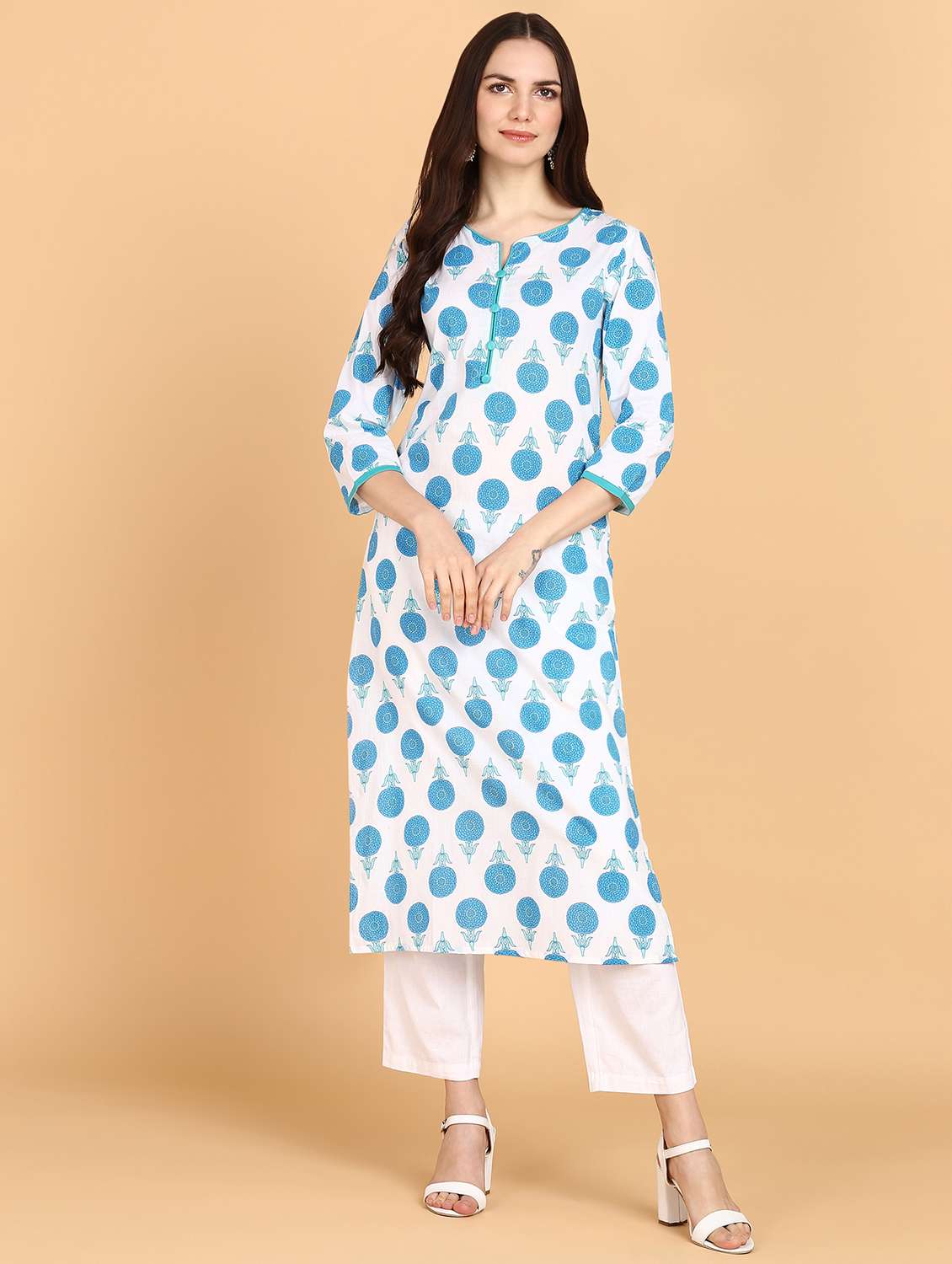 - Grab this beautiful kurta made up of cotton fabric featuring round neck designs.