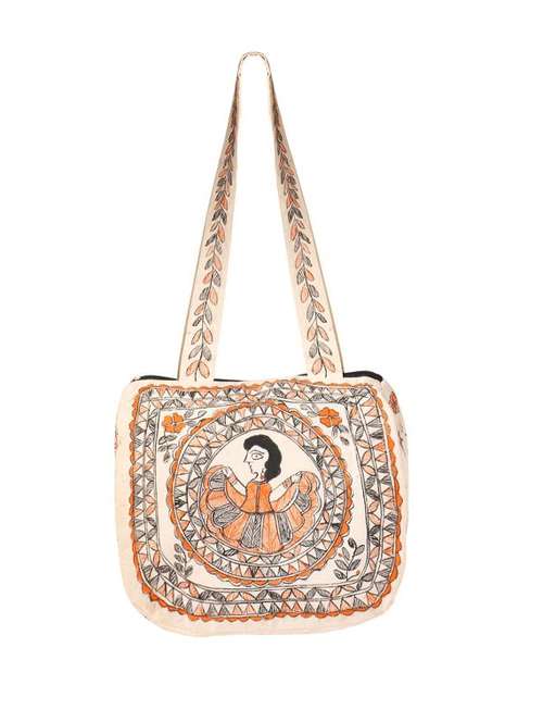 imithila lady dancing in orange choli madhubani style handpainted shoulder bag for women and girls