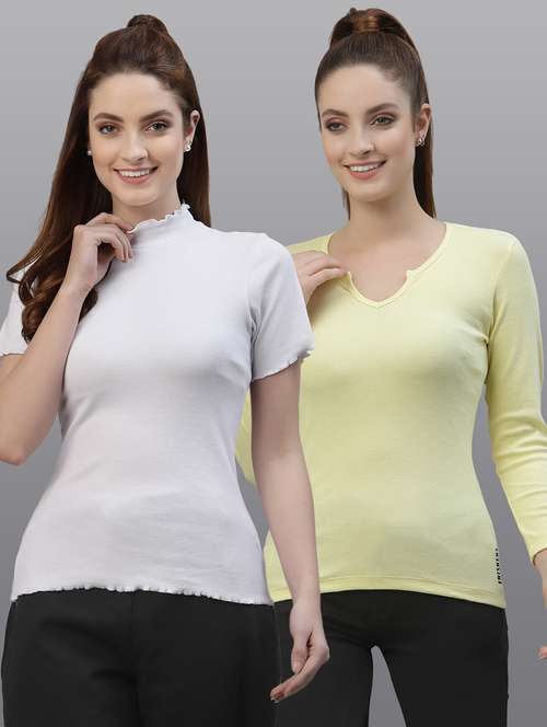 - Opt for this top made up of cotton lycra material and get it in a varied neck design.