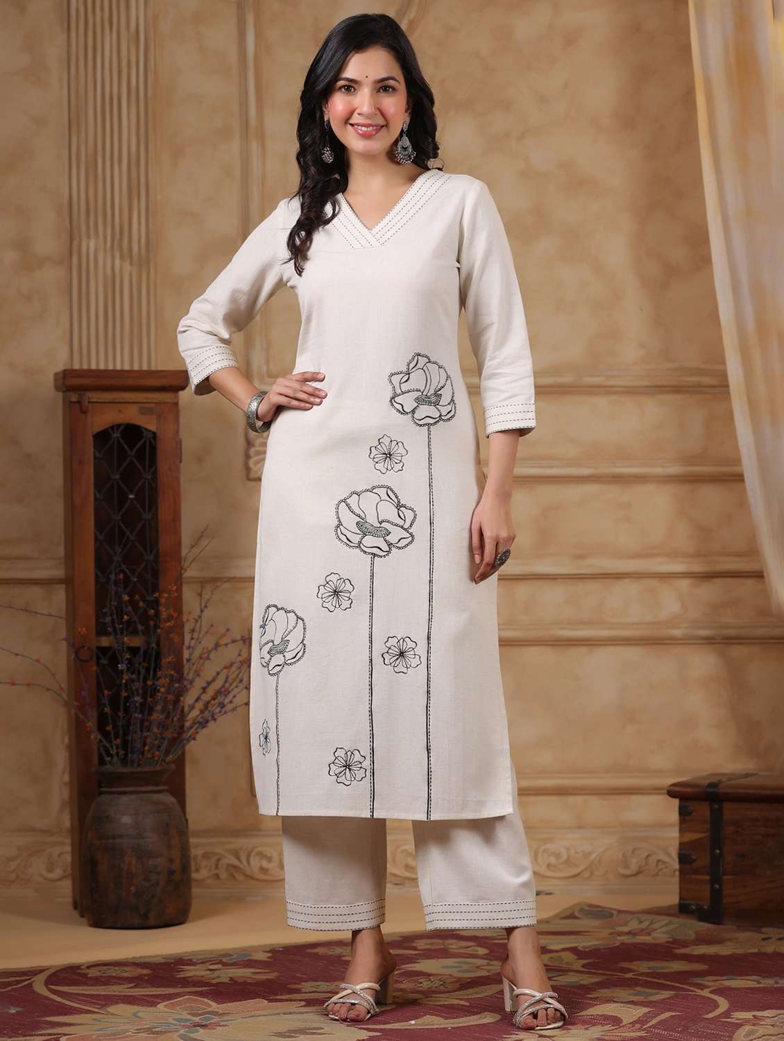- Browse through the latest range of ethnic sets for women with tailored sleeve designs with embroidered works.