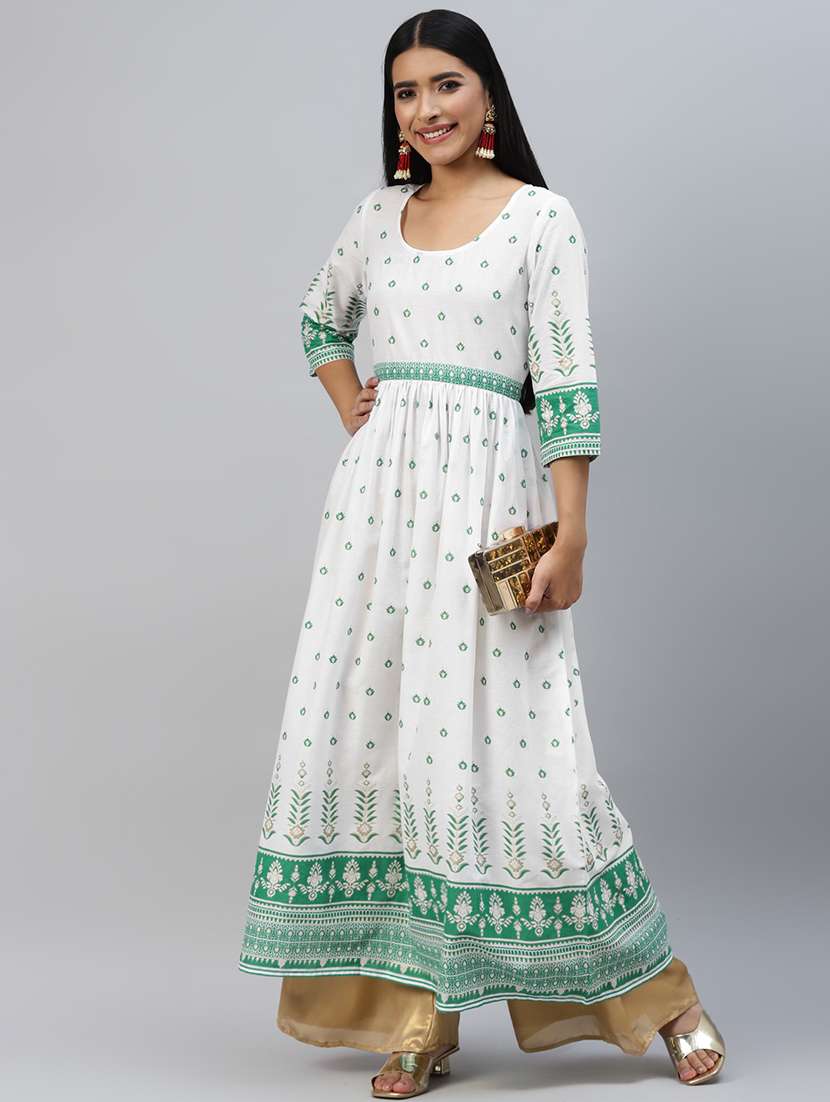 women white printed round neck flared kurta