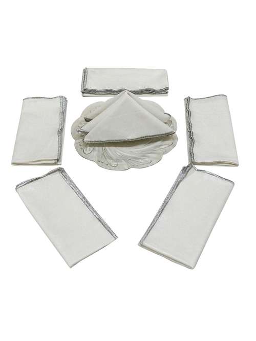 Soft and luxurious cotton table napkins set of 6 pc. The texture is great and absorbent.There is silver embroidery finish on the edges to give it classic and festive look. Made of cotton. It is long lasting and durable. Easy to wash and maintain.