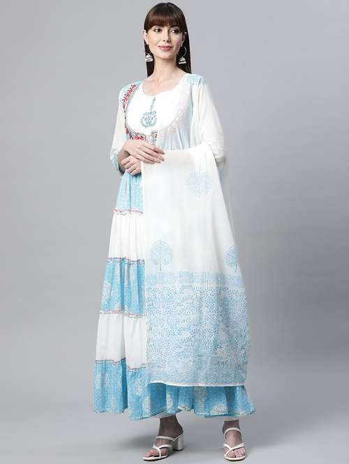 women three quarter sleeve embroidered anarkali kurta with dupatta