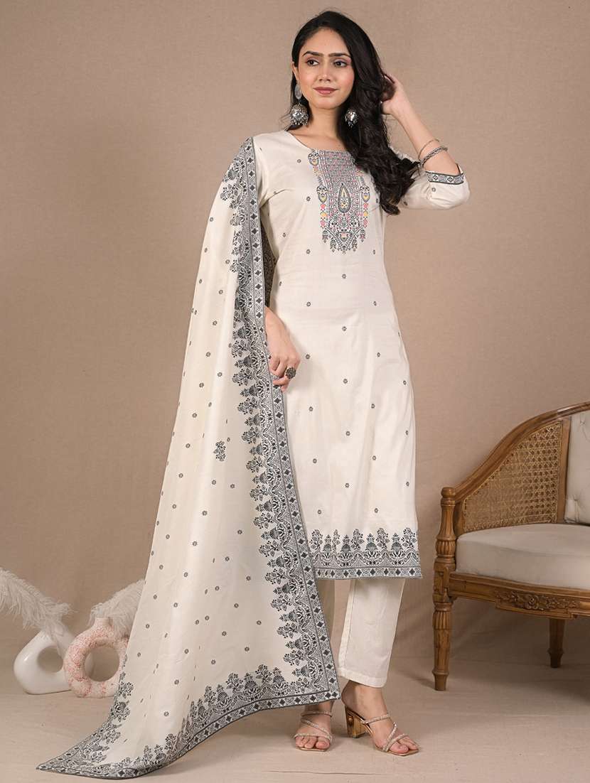 - Find gorgeous sets of ethnic wears in trending designs in white colors suitable for casual wear of occasions.