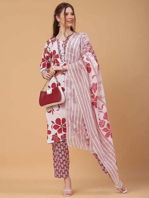 - Find gorgeous sets of ethnic wears in trending designs in red colors suitable for casual wear of occasions.