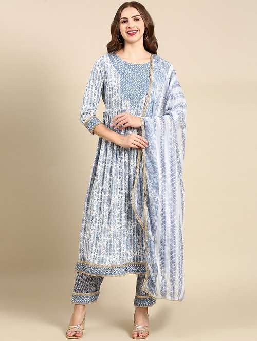 - Find gorgeous sets of ethnic wears in trending designs in grey colors suitable for casual wear of occasions.