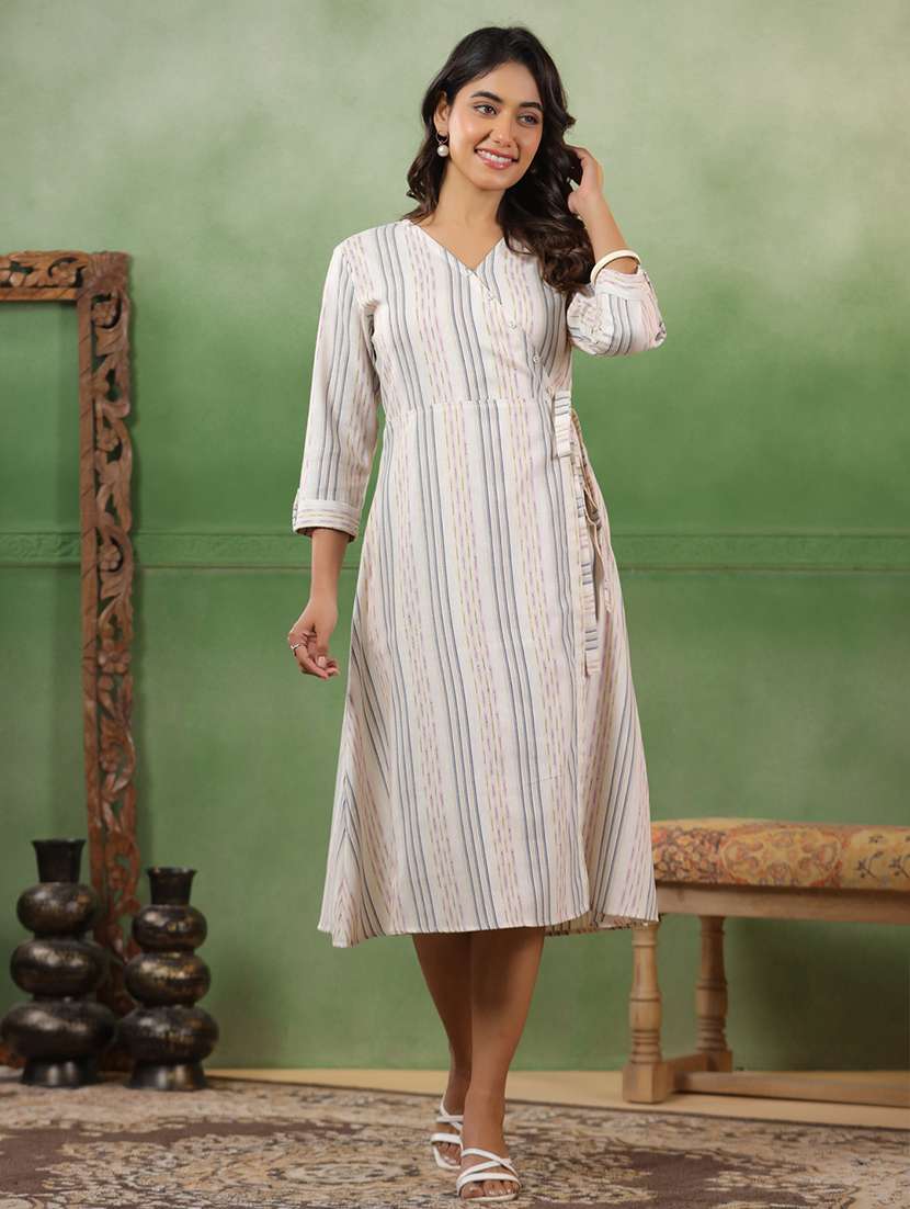 women striped three quarter sleeve angrakha ethnic dress