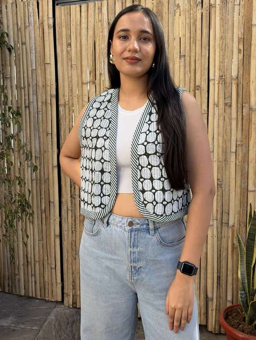 - » women printed sleeveless crop jacket