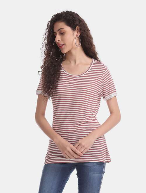 brown horizontal striped regular neck top