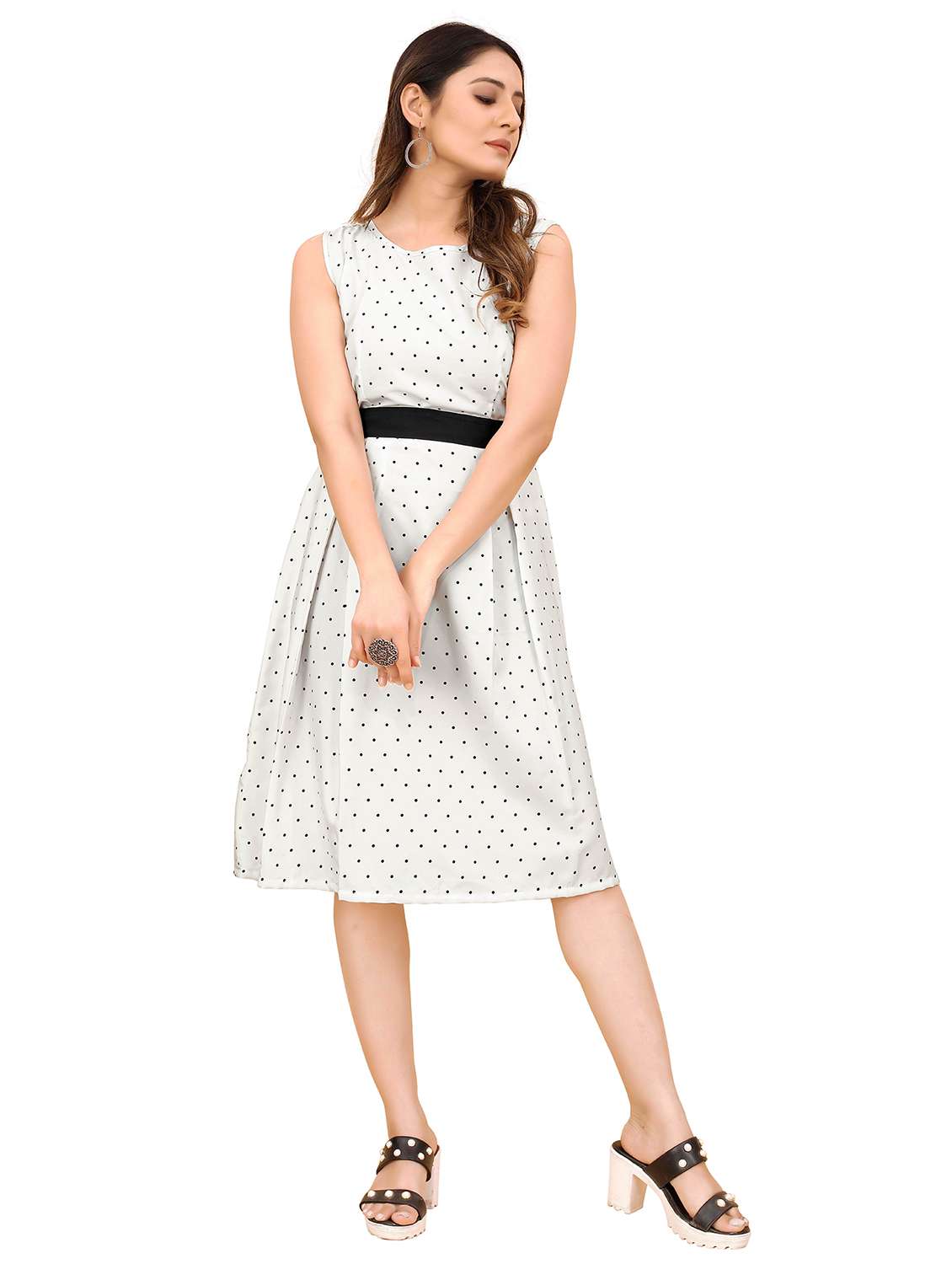 white polka doted sleevless fit & flare dress