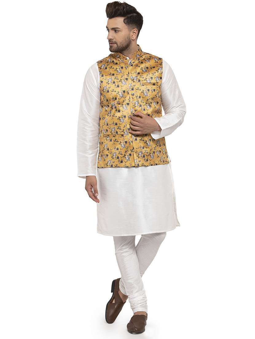 white solid dupion kurta pyjama set with mustard printed nehru jacket