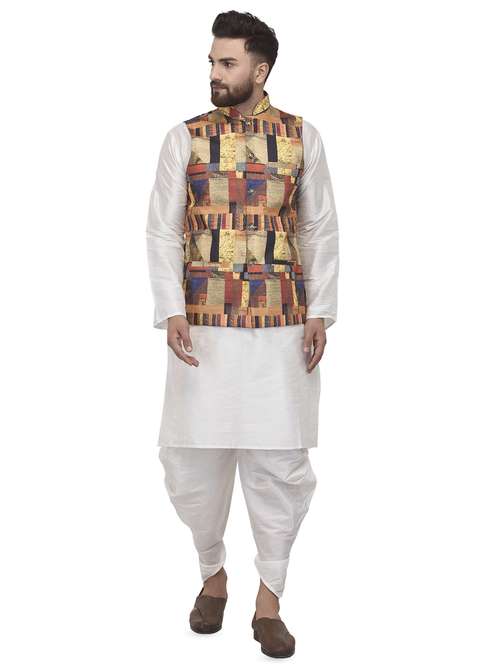 - » white solid dhoti kurta set with multi colored printed nehru jacket