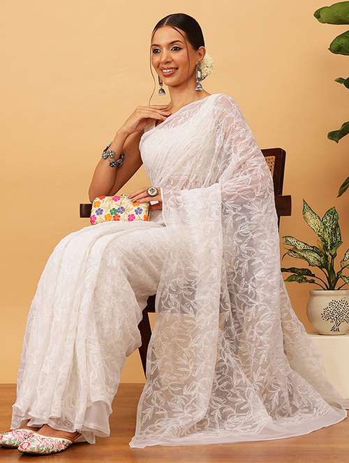 Silhouette: This White Georgette Lucknowi Chikankari Saree with Blouse. Crafted with finesse by skilled artisans, this saree embodies the timeless charm of Lucknowi Chikankari embroidery, a legacy of Indian craftsmanship. The vibrant White hue adds a touch of allure to the soft georgette fabric, making it perfect for special occasions and festivities.The intricate Chikankari work adorns the saree with delicate floral motifs, meticulously hand-embroidered with precision and care. Each stitch narrates tales of heritage and artistry, adding depth and character to this masterpiece. The lightweight georgette fabric drapes gracefully, enhancing the wearer's silhouette with its fluidity and movement.