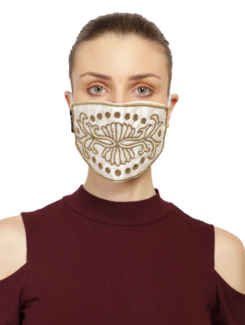 Anekaant 3-Ply White & Gold Art Silk Embellished Fabric Fashion Mask