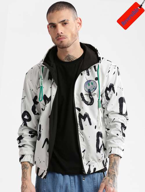 SHOWOFF Men's Hooded White Typography Reversible Casual Oversized Jacket