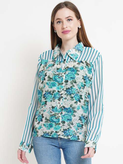 White regular shirt style top Floral print Shirt collar, long, cuffed sleeves Woven georgette Button closure