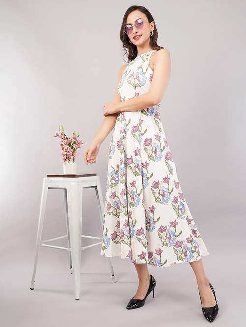 White-coloured Printed fit & flare dress Halter neck Sleeveless, no sleeves Midi length in high-low hem Zip closure
