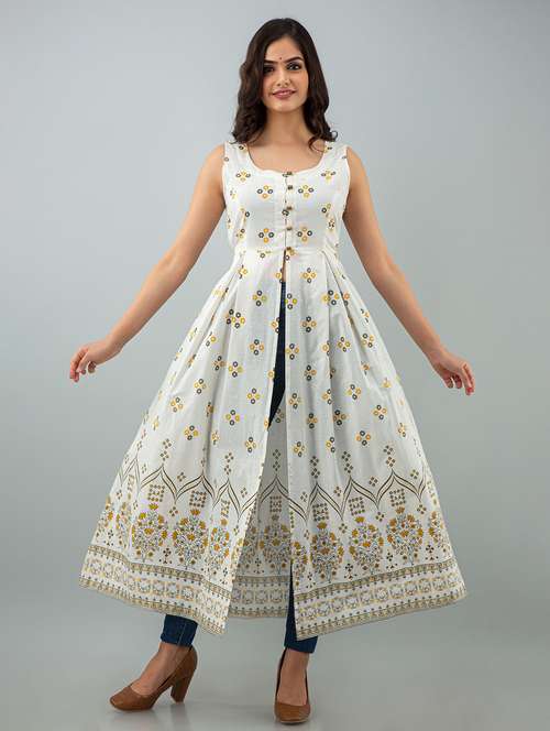 - » women floral printed sleeveless front slit kurta