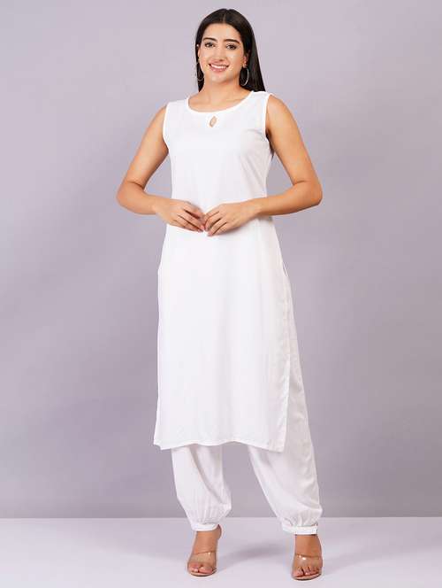 - Find gorgeous sets of ethnic wears in trending designs in white colors suitable for casual wear of occasions.