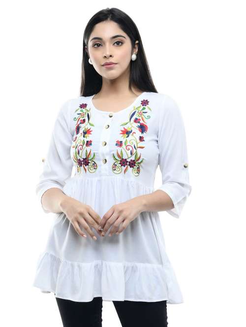 - Opt for this top made up of rayon material and get it in a varied neck design.