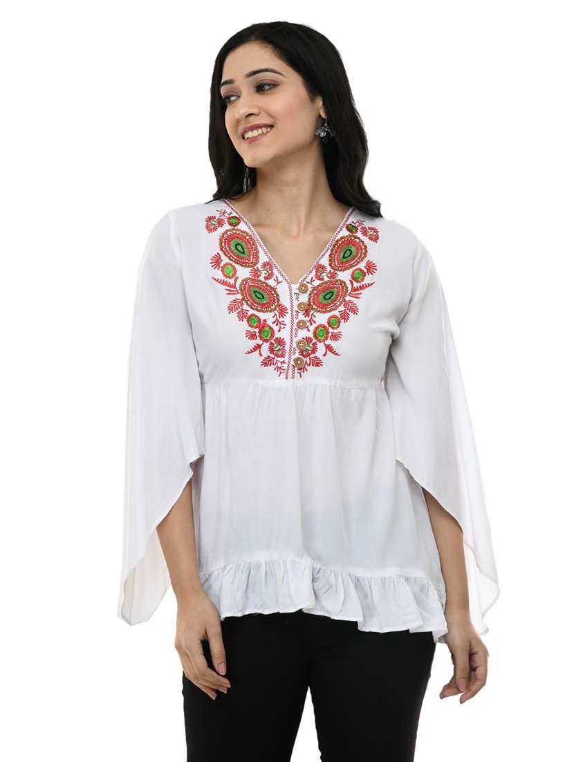MAAHI Women's Rayon Off White Embroidery Casual Top
