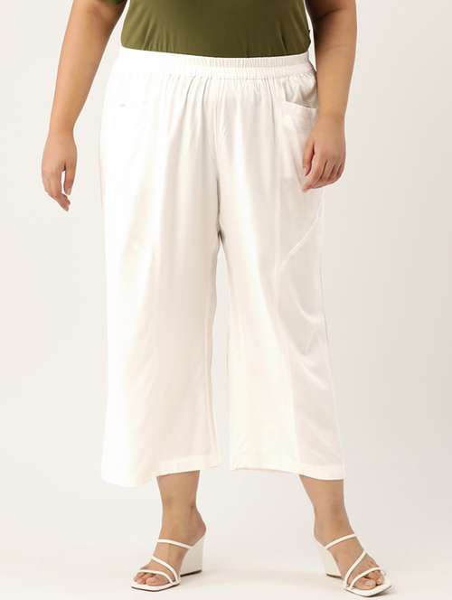 theRebelinme Plus Size Women's White Solid Color Woven Trouser, has an elasticated waist band, two front pockets and staright hem.