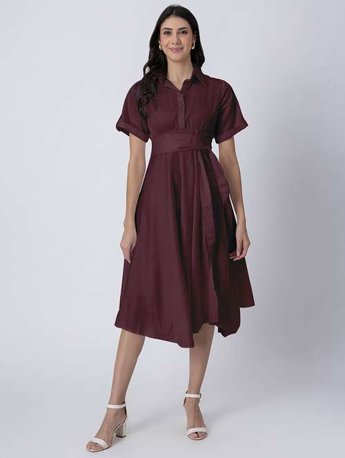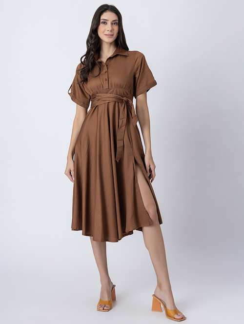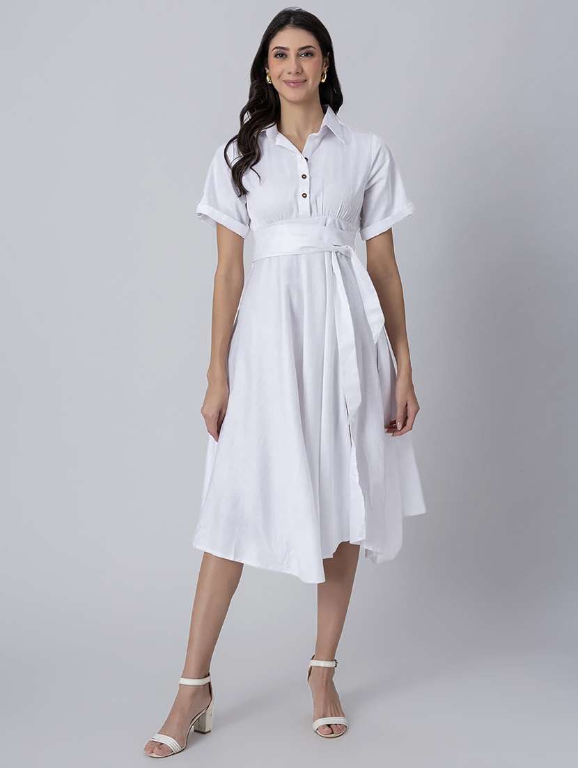 Includes:This clothing consists of 1 Dress (Any accessories worn by the model are not for sale)*Material:Cotton Satin Slub *Dress Length: 46 inches (Approx.)*Model Stats:Model is 5'10\" tall, with a 33\" bust, and is wearing a size Small (S).*Features:Dress featuring a chic side leg slit and classic collar with buttons. The smocked back waist ensures a flattering fit, complemented by a long wrap belt and rolled sleeves for a versatile look. Perfect for the modern girl boss.*Care:Hand wash in cold water with mild detergent; avoid bleach; iron on low heat; tumble dry on low or line dry to maintain fabric quality. *Size Information:Please refer to our size chart before making the purchase. If your size is in between two sizes, we recommend that you choose a larger size.