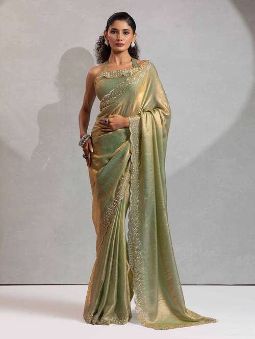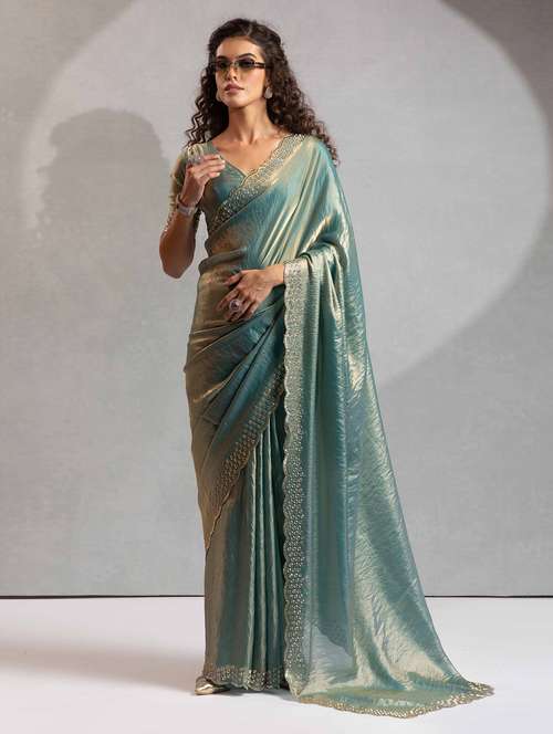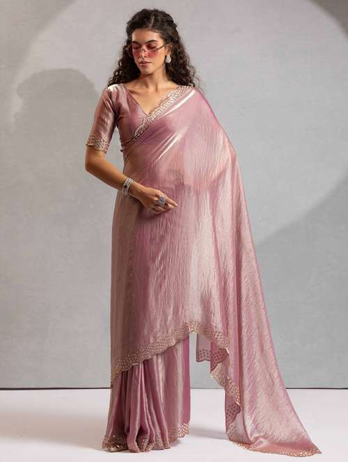 This shimmery White satin chiffon saree, adorned with glamorous stone embellishments that add a radiant touch. The satin chiffon fabric offers a soft, fluid drape with a subtle sheen, creating a flattering silhouette. It is paired with an unstitched matching blouse piece, giving you the freedom to tailor it as per your preferred style. Perfect for festive gatherings, wedding functions, and evening parties, this saree is designed to make you shine with effortless elegance.