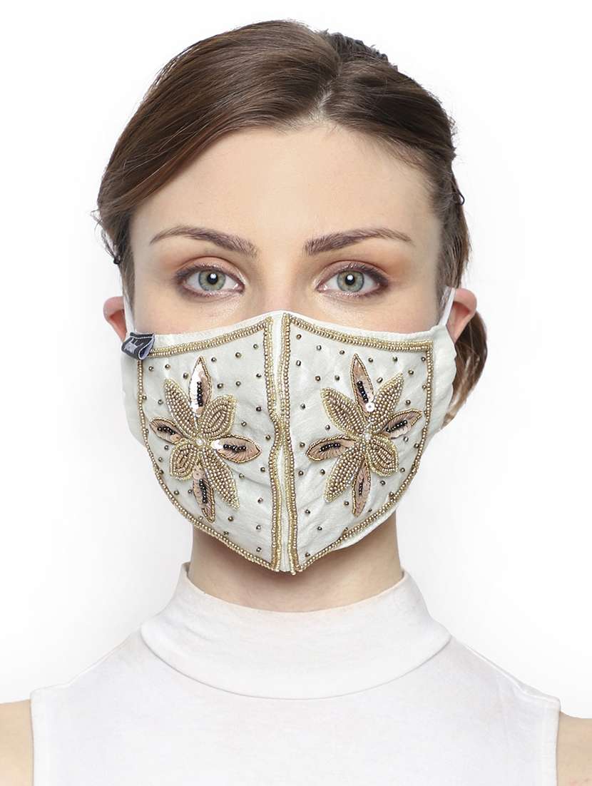 Anekaant 3-Ply White & Gold Art Silk Embellished Fabric Fashion Mask