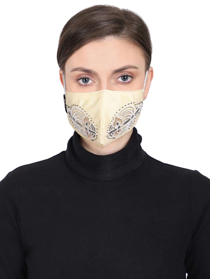 Anekaant 3-Ply Cream & Gold Embellished Art Silk Fabric Fashion Mask