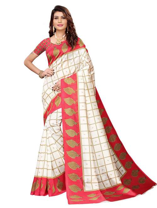 women cream checks printed bordered saree with blouse