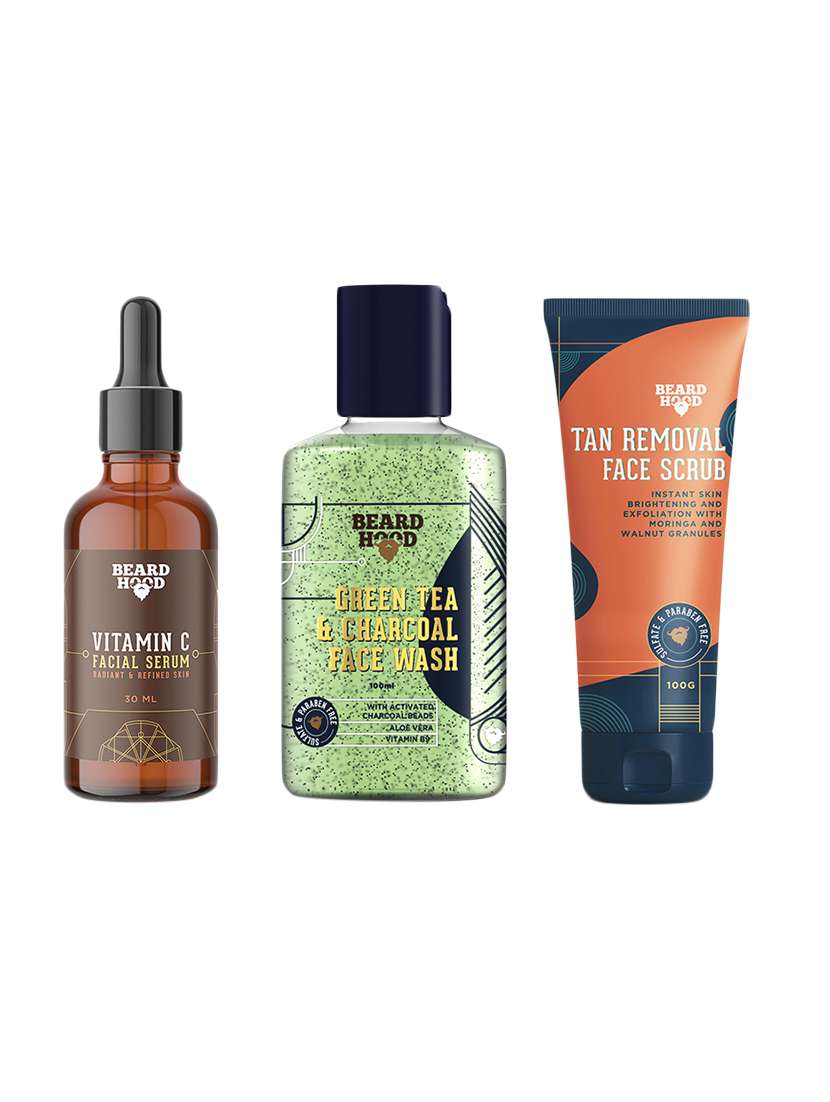 beardhood face care kit (vitamin c serum, green tea face wash & tan removal face scrub), gift box pack of 3