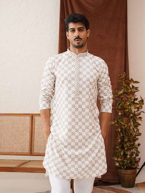 White Sequins & Embroidered Kurtas, White straight above knee kurta, has a mandarin collar, long sleeves, straight hem.