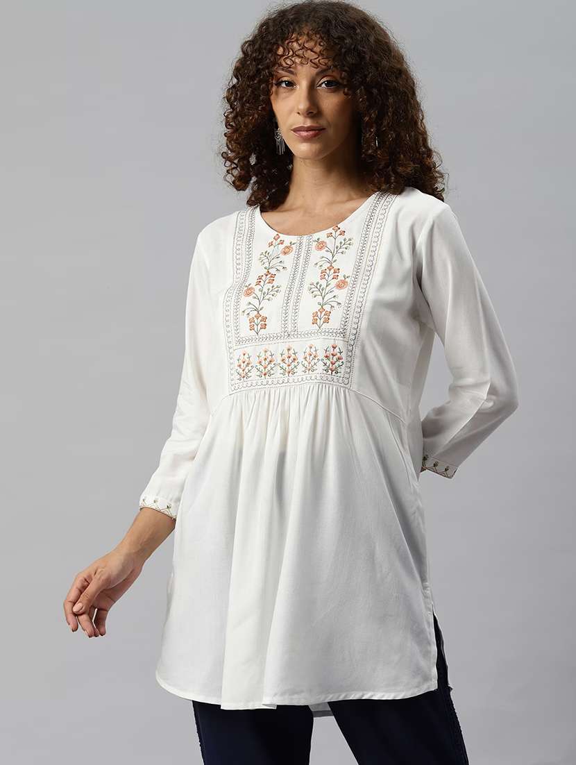 - » women white round neck a-line kurti