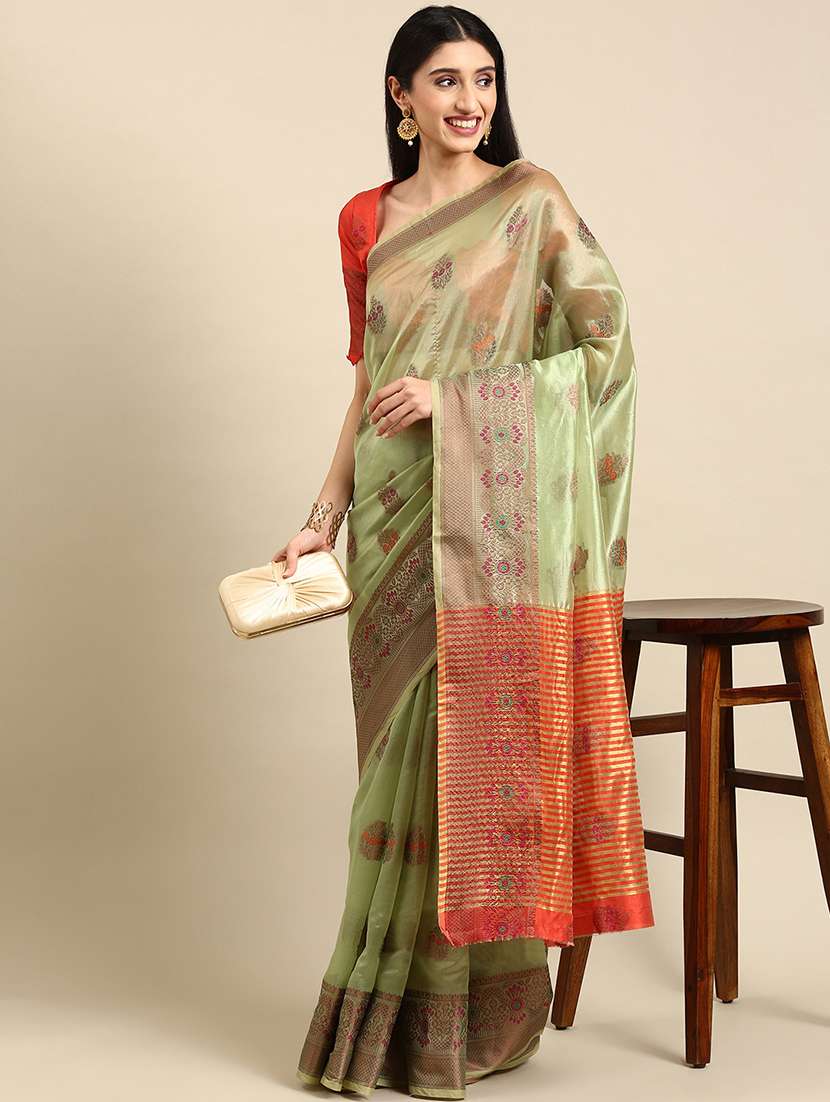 - » women olive self design bordered saree with blouse