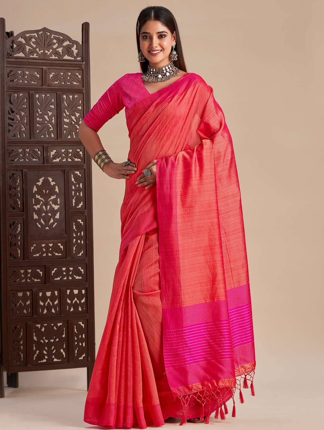 women pink solid bordered saree