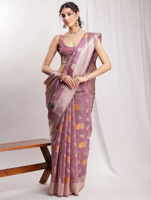 Step into refined elegance with this mauve linen blend jacquard saree, featuring an intricately woven floral pattern that brings depth and charm. Delicate multi-coloured jacquard weaves scattered across the fabric add a touch of vibrancy, while the rich linen texture ensures a soft, graceful drape. Lightweight yet striking, this saree is perfect for festive gatherings, celebrations, and special occasions. Pair it with a complementing blouse and subtle jewellery for a timeless and sophisticated look.