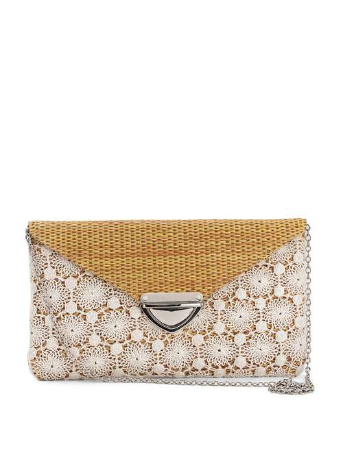 yellow and white jute clutch