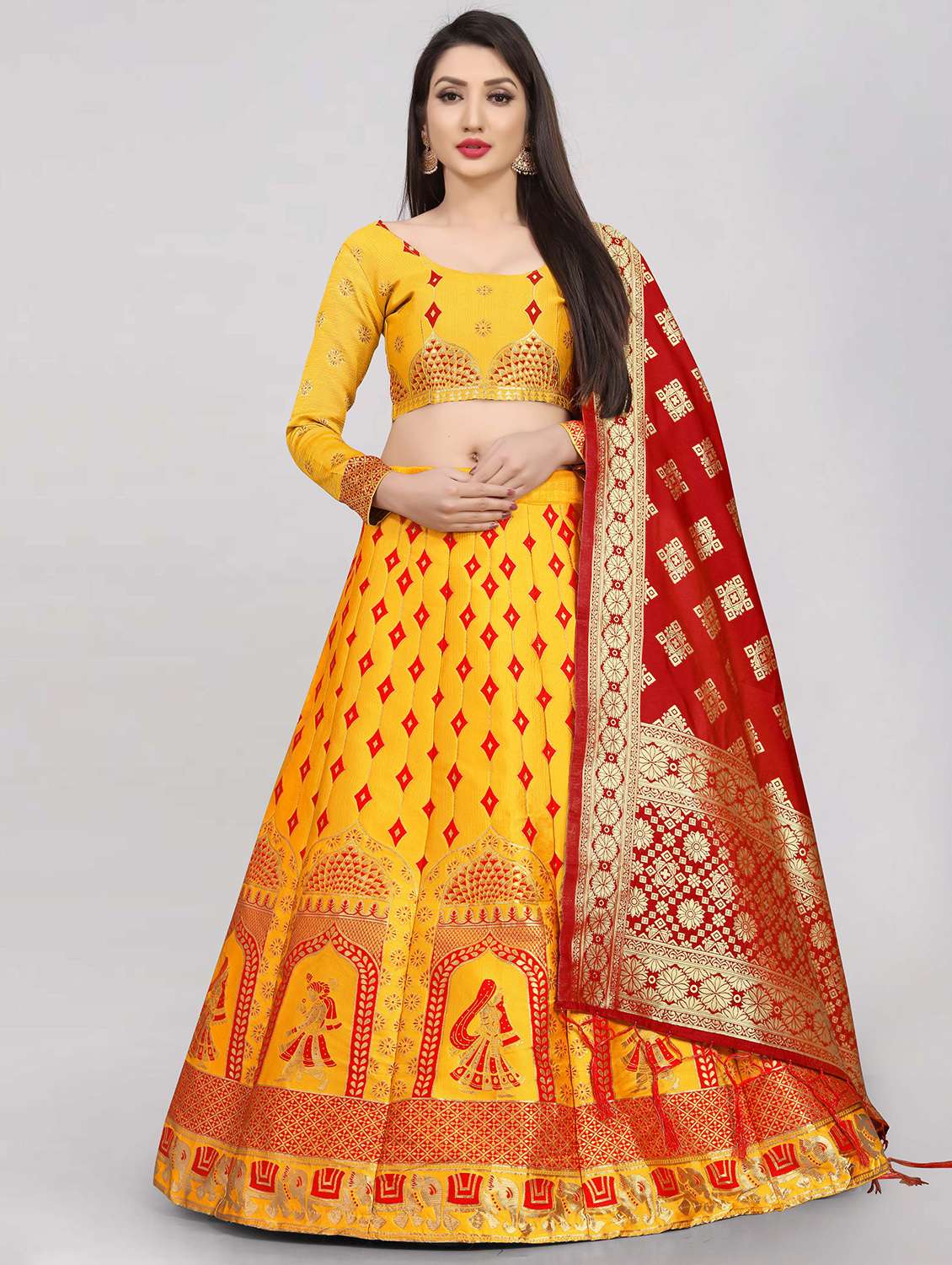 - » yellow banarasi flared lehenga