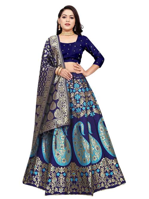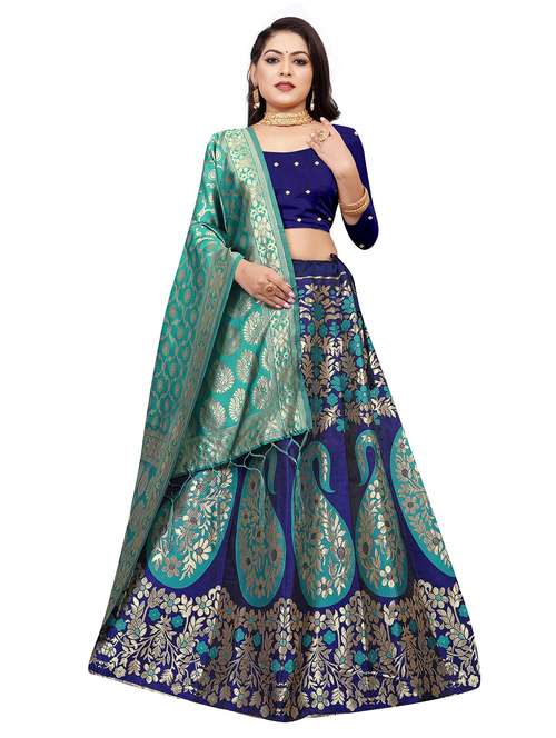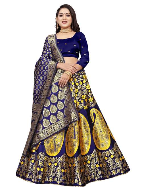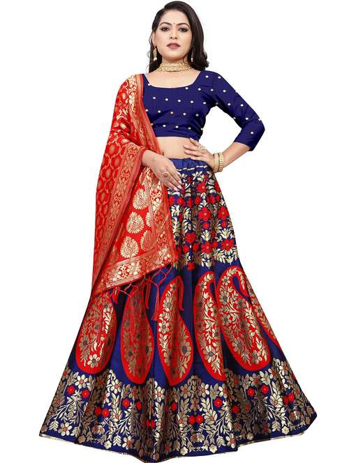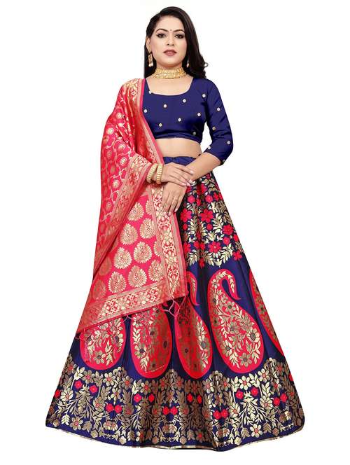 This stunning lehenga choli set from KRISIO is crafted from a Banarasi silk jacquard fabric and features a beautiful contrast dupatta. The lehenga has a gorgeous floral design with intricate embroidery and embellishments, while the blouse has a lovely round neckline and long sleeves. The contrast dupatta brings the entire ensemble together. This is the perfect ensemble for an evening of traditional festivities or a special occasion.