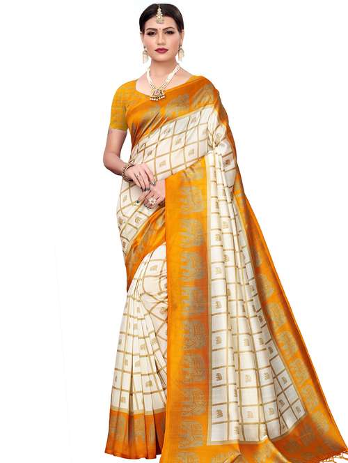 Pisara Yellow and Off White Mysore Art Silk Printed Saree