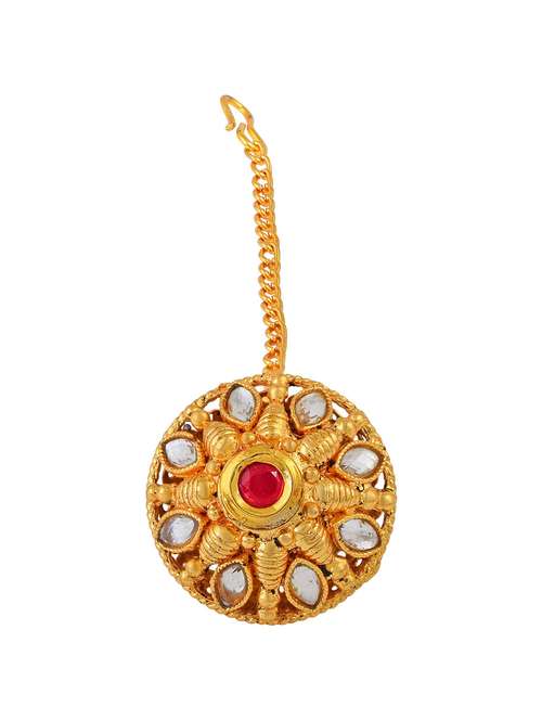 Made with Micron Goldplated Brass Alloy, this Magtikka is also known as Bindi Borla in Rajasthan and Raakdi in Gujarat. This ethnic Hair jewellery, is finely handmade with Kundan, and further supported by Goldplated chain which has a clip, and is fixed in hair. It looks stylish, and brings attraction to the face, and enhance the look of all jewellery. Currently in trend, this Ethnic jewellery has made a comeback due to recent historical films like JodhaAkbar, Padmavati etc.