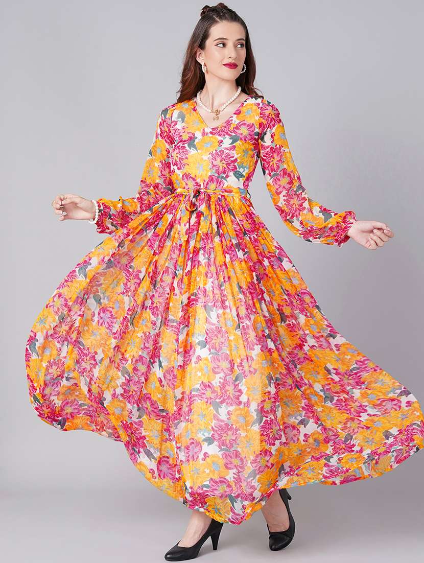 - Dress up in a soothing pattern and don this dress made of chiffon material.
